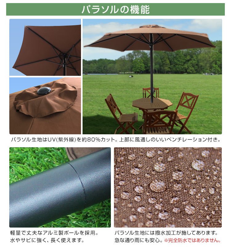 UVカットが施された210cmサイズのパラソルが強い日差しから守ってくれるので、直射日光を気にせず快適にガーデンライフを楽しんでいただけます!