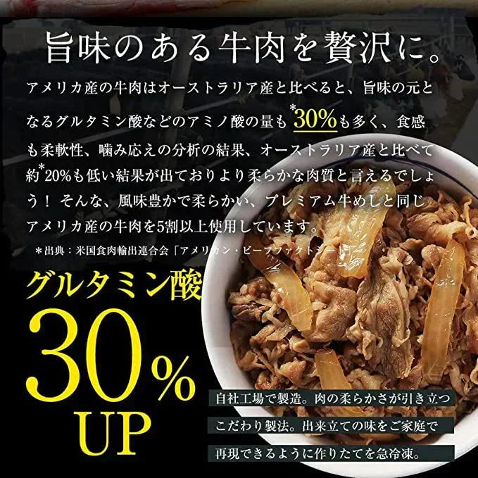 赤身と脂身のバランスの良い北米産牛肉を、甘味料・保存料を使用していない秘伝の「プレミアムたれ」で煮込んで仕上げております。