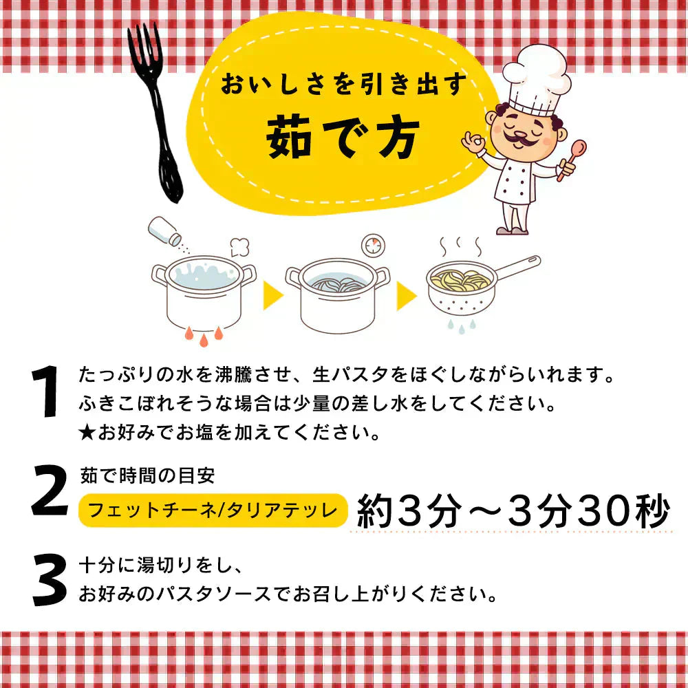 フェットチーネ/タリアテッレ 約3分から3分30秒(お好みで調整してください。)