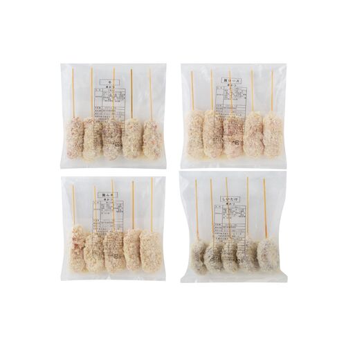 ■規格:豚ロース串カツ25g×5(計125g)、牛串カツ25g×5(計125g)、鶏ムネ串カツ30g×5(計150g)、椎茸串カツ25g×5(計125g)(4種・計20本)