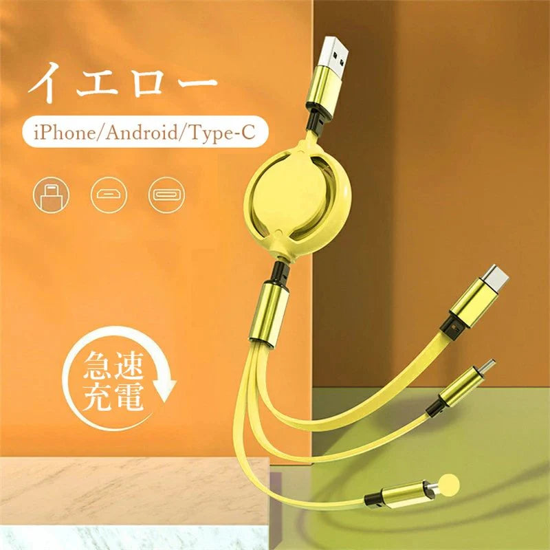 USB 3in1 充電ケーブル 3in1 巻き取り ケーブル iPhone 充電ケーブル iPhone 12 Pro Max USBケーブル 巻き取り USB Type-c 巻取り 充電 Android 一本三役 iPhone 12/12 Pro 3A 急速充電 在宅勤務 プレゼント w371A(ブラック)