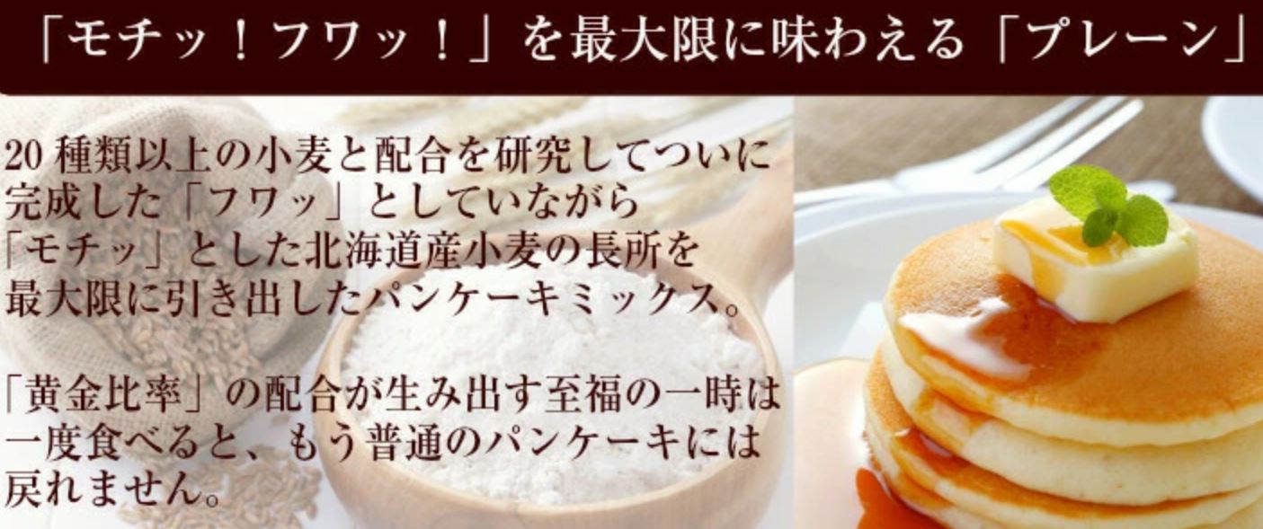 もちもち・ふわふわ!素材にこだわり北海道産の小麦、バターミルク、砂糖を100%使用!!アルミフリーの膨張剤を使用しているためお子様でも安心して召し上がれます。卵と牛乳があればいつでもお店の味がご家庭で♪トランス脂肪酸不検出!防腐剤不使用!ホットケーキ・ホットケーキミックス好きに!・(プレーン)小麦粉、砂糖、バターミルクパウダー、コンスターチ、膨張剤、塩、乳化剤、バニラビーンズ(原材料の一部に乳、大豆を含む)・(ココア)小麦粉、砂糖、ココアパウダー、バターミルクパウダー、コンスターチ、膨張剤、塩、乳化剤、バニラビーンズ(原材料の一部に乳、大豆を含む)・(メープル)小麦粉、メープルシュガー、砂糖、バターミルクパウダー、コンスターチ、膨張剤、塩、乳化剤、香料、カラメル色素(原材料の一部に乳、大豆を含む)