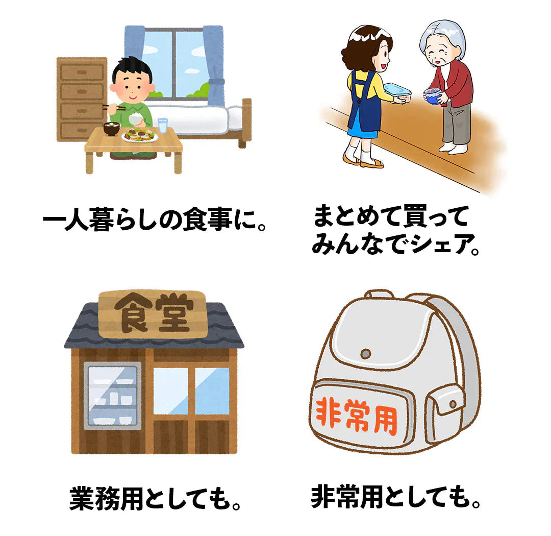 賞味期限が約1年と長く、業務用としてお使いいただいたり、災害時の非常食・保存食として備蓄しておくこともできます。