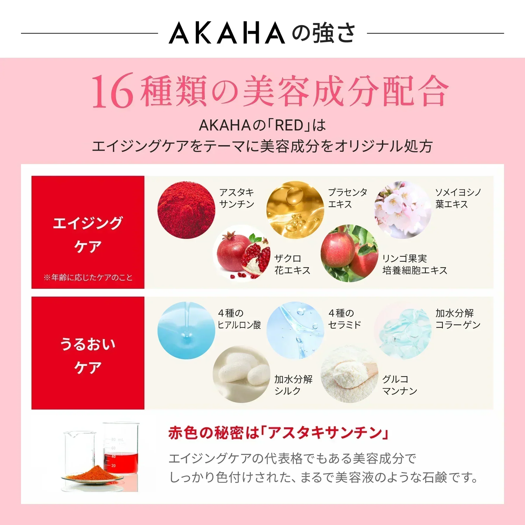 赤色の秘密は、美容成分「アスタキサンチン」の色です。(合成着色料不使用)プラセンタエキス、ソメイヨシノ葉エキス、リンゴ果実培養細胞エキスに、保湿に不可欠なヒアルロン酸とセラミドなどが配合。汚れを落としながら、大人の肌悩みにも優しく寄り添う美容石けんです。