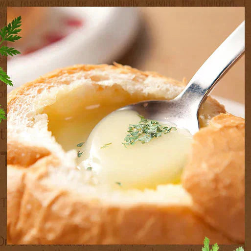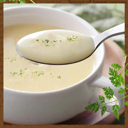 原材料名: でん粉(国内製造)、食塩、乾燥マッシュポテト、脱脂粉乳、玉葱エキス粉末、砂糖、乳等を主要原料とする食品、乾燥玉葱粉末、鶏エキス粉末、酵母エキス、牛エキス粉末、たん白加水分解物加工品、野菜香味調味料、チーズ粉末、胡椒、ローレル粉末、食用植物油脂、セロリ粉末、うきみ・具(フライドオニオン、乾燥パセリ)/調味料(アミノ酸等)、増粘剤(キサンタンガム)、乳化剤、安定剤(加工デンプン)、香料、カラメル色素、キシロース、V.B1、酸味料、酸化防止剤(V.E)、香辛料抽出物、(一部に小麦・乳成分・牛肉・大豆・鶏肉・豚肉・ゼラチンを含む)