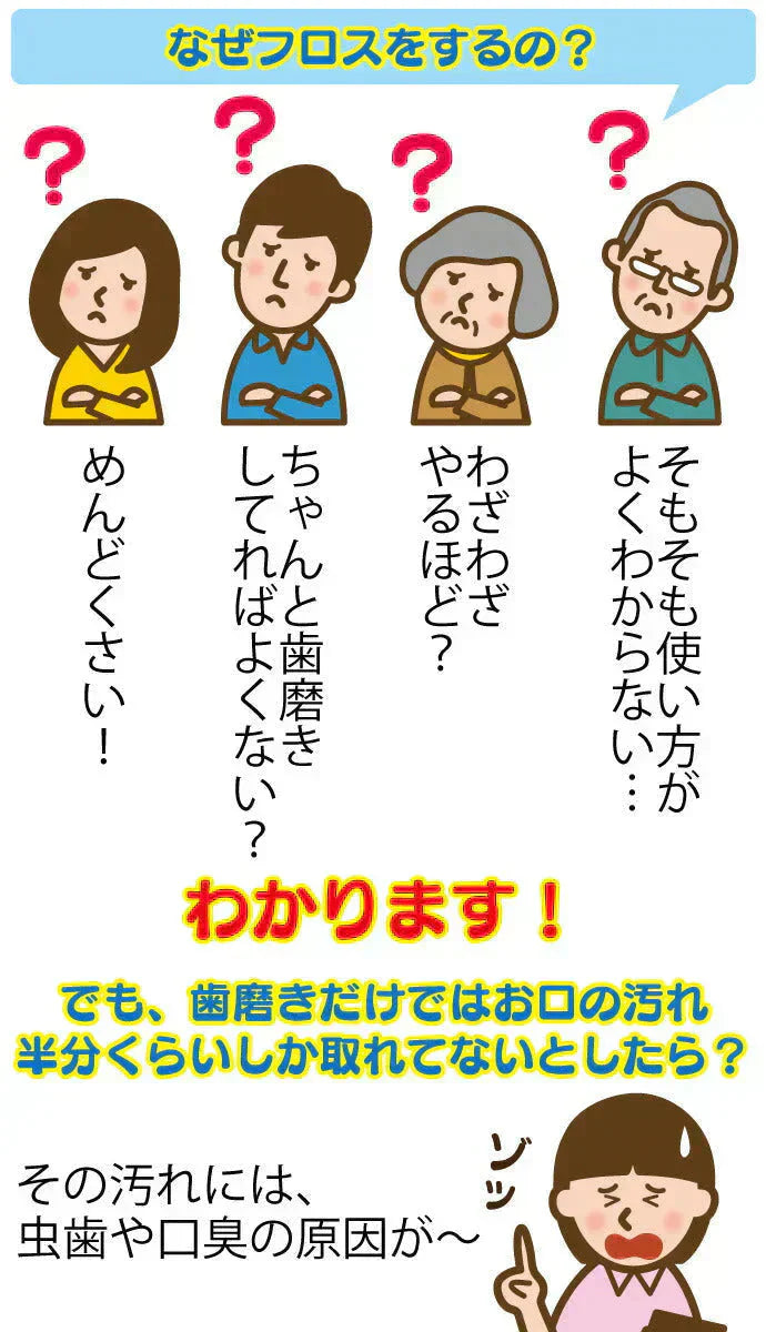 歯ブラシの届きにくい歯と歯の間や歯と歯ぐきの境目の汚れをデンタルフロスでケアすることでプラークコントロール効果が高まります。