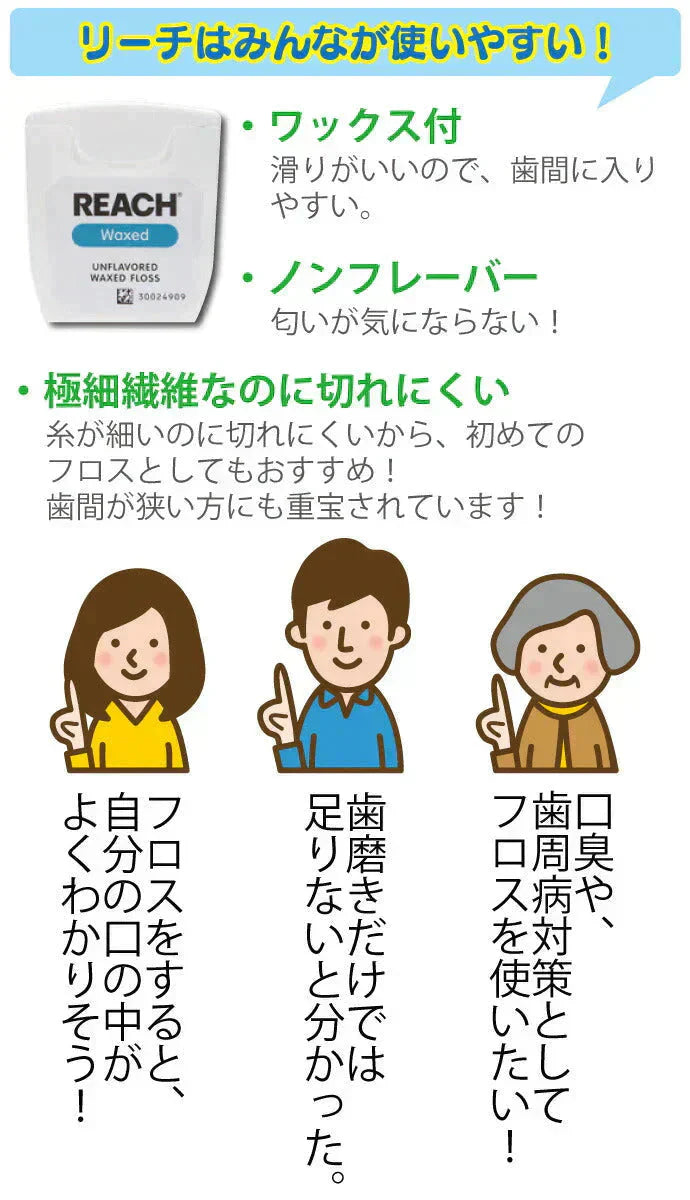 REACH リーチ/デンタルフロス 55ヤード(50.3m)×3個入り ワックス・ノンフレーバー【メール便送料無料】