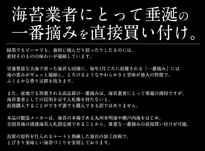 海苔の本場である九州地区や瀬戸内地区をはじめ、全国の漁連の「海苔入札指定商」であることが本品製造メーカーの強みの一つです。