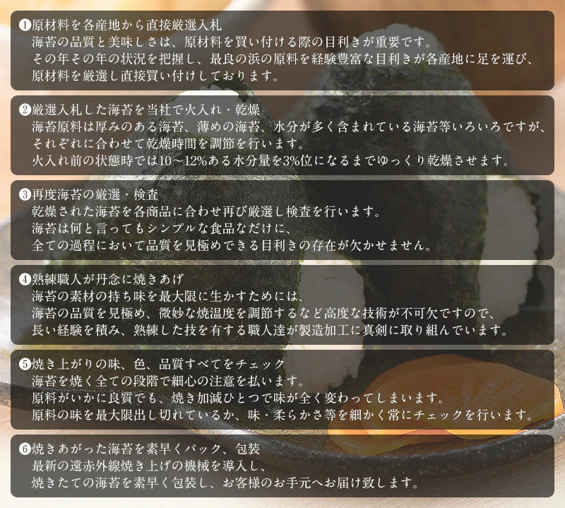 毎年仕入れる量は全国トップクラスで、年間約1億8,000万枚の海苔を加工販売しており、生産量だけでなく味の追求や品質へのこだわりについても最高水準であることを自負。