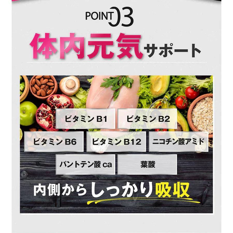 原材料名:還元麦芽糖水飴(国内製造)、HMB-Ca、L-4カルニチンフマル酸塩、フィッシュコラーゲンペプチド、プロテオグリカン含有サケ鼻軟骨抽出物(デキストリン、サケ鼻軟骨抽出物)ゼラチン、ステアリン酸Ca、ピロリン酸第二鉄、L-ロイシン、ニコチン酸アミド、微粒二酸化ケイ素、L−バリン、L-イソロイシン、リン酸三Ca、パントテン酸三Ca、着色料(クチナシ、二酸化チタン)、ビタミンB2、ビタミンB6、ビタミンB1、ヒアルロン酸、葉酸、ビタミンB12