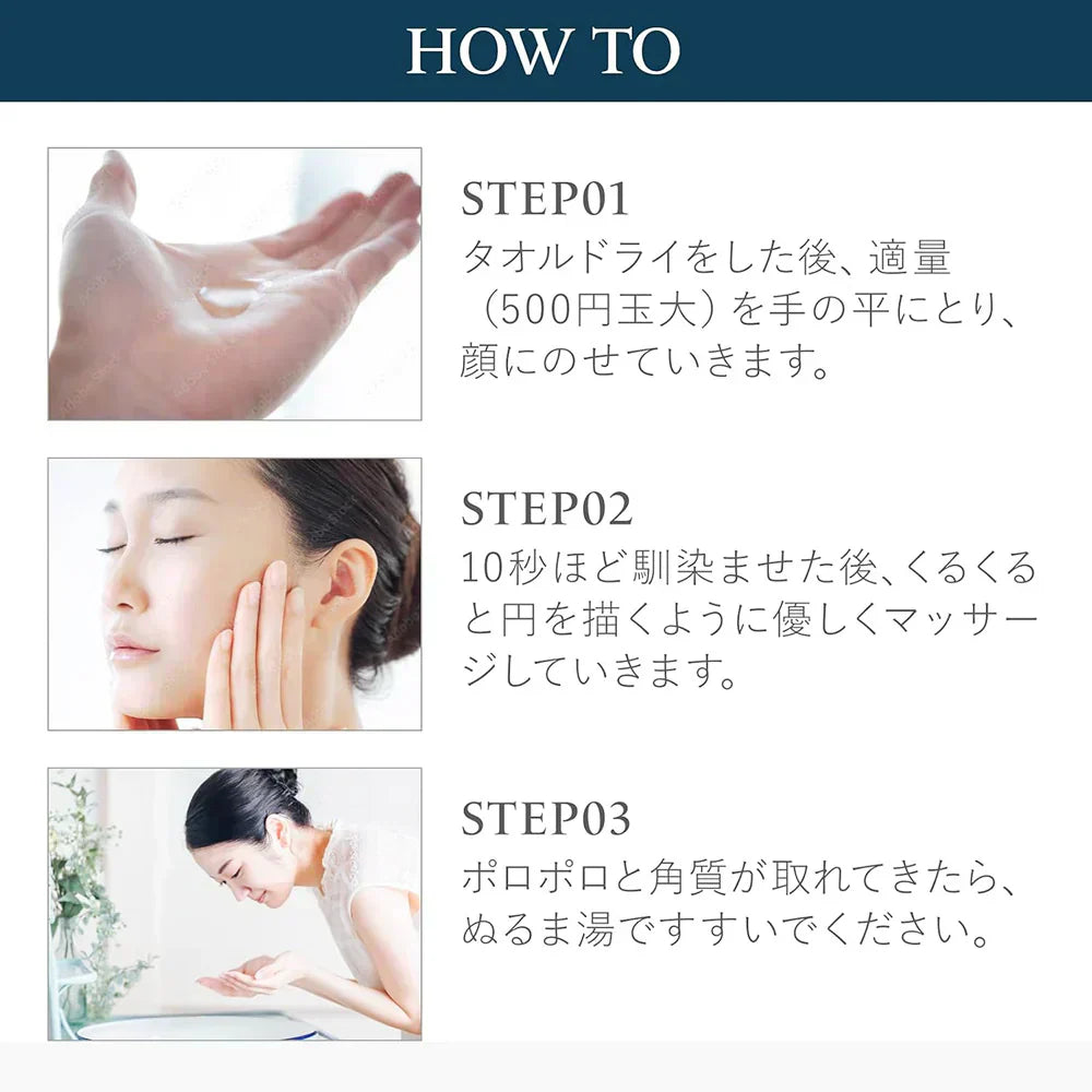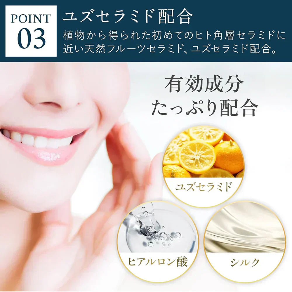 お肌に優しい天然ユズセラミドと高品質シルク、高濃度ヒアルロン酸 を絶妙なバランスで配合。ジェルを付けて軽くマッサージするだけで、古い角質がポロポロと取れ、洗い流した後は、モチモチ・ツルツルのタマゴ肌に。その後の化粧水の吸い込み方、お化粧のノリまで今までと違います。