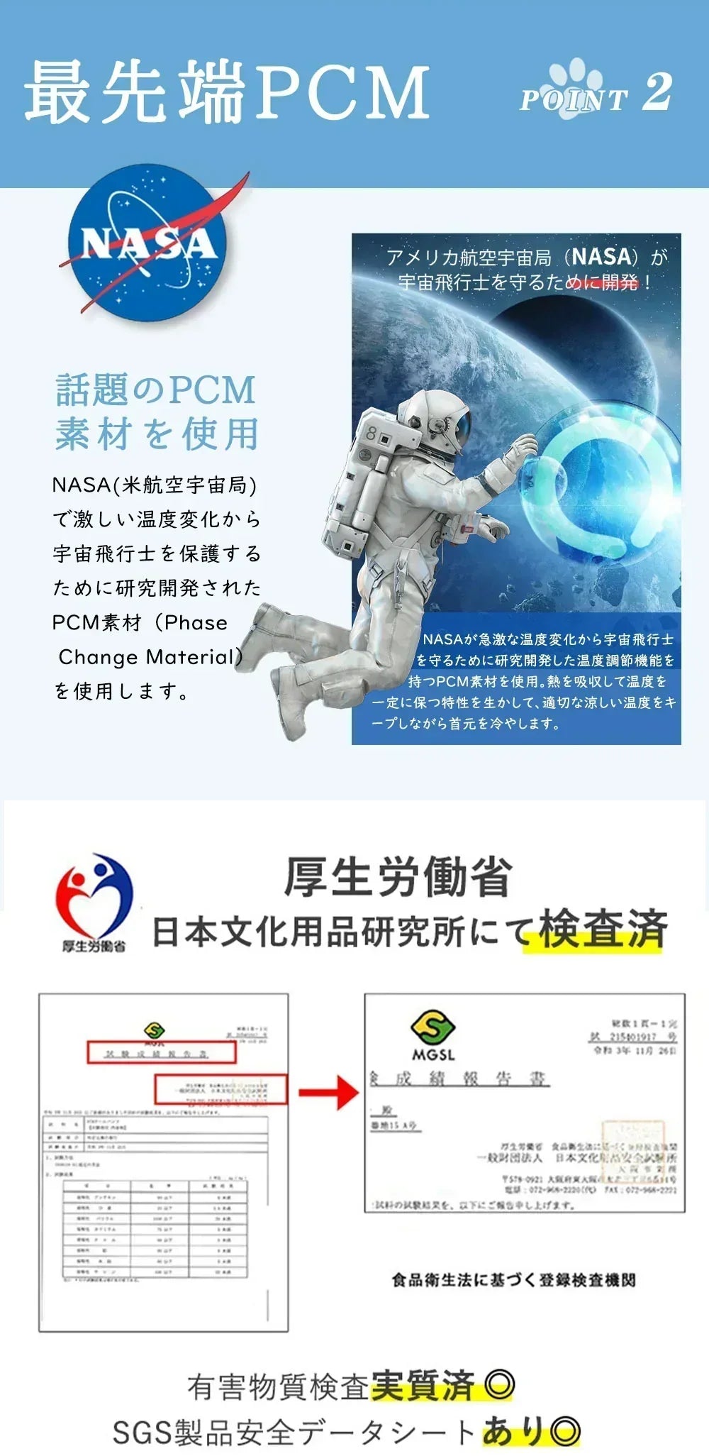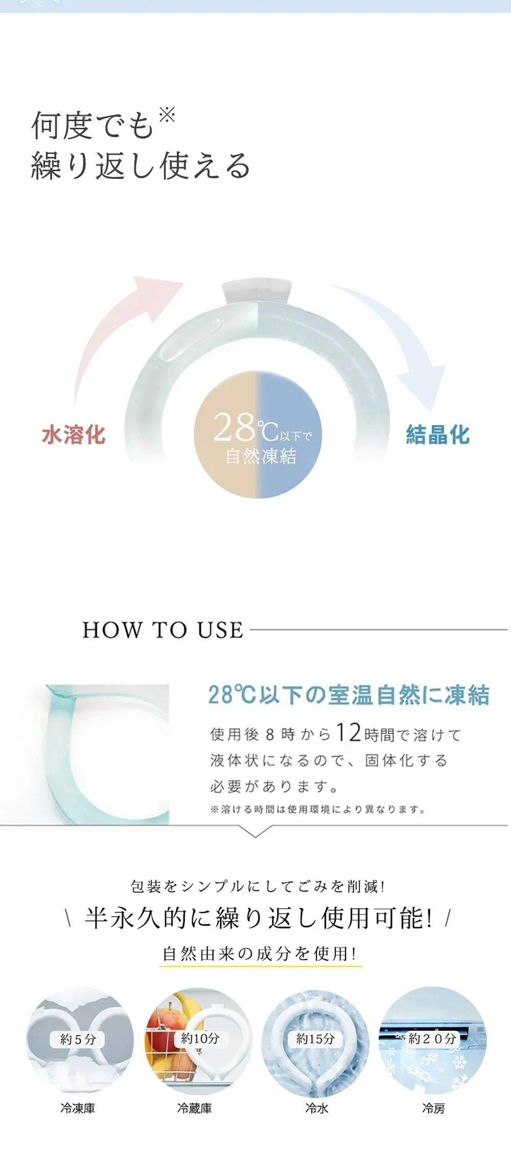 【28度の室内で自然氷結冷蔵庫不要】弊社のクールリングはNASAが開発した最新先端技術のPCM素材を採用しています。PCM素材の特性は凝固するのが早く、融解するのが遅いのが特徴的であり、夏の熱中症対策や暑さ対策に最適です。弊社製品は、よくある市販の18度氷結タイプとは異なり、使用後に室内温度が28度以下であれば、放置するだけで自然に氷結され、冷蔵庫がない環境でも、繰り返して手軽にご使用頂けます。