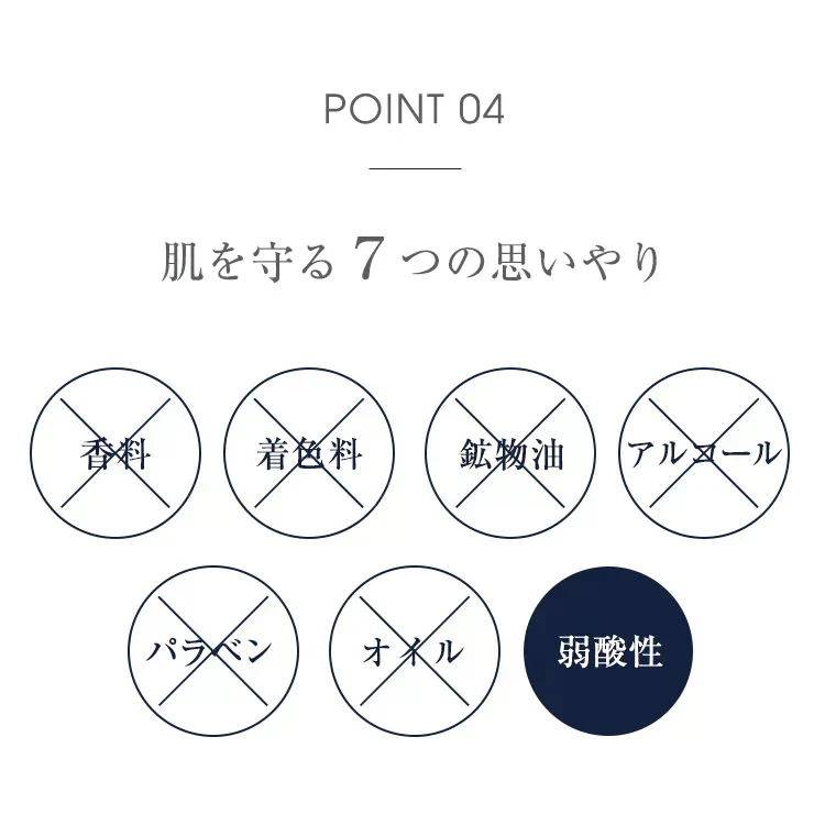 無香料、無着色、無鉱物油、アルコールフリー、パラベンフリー、オイルフリー、弱酸性と7つの思いやりでお肌を守ります。
