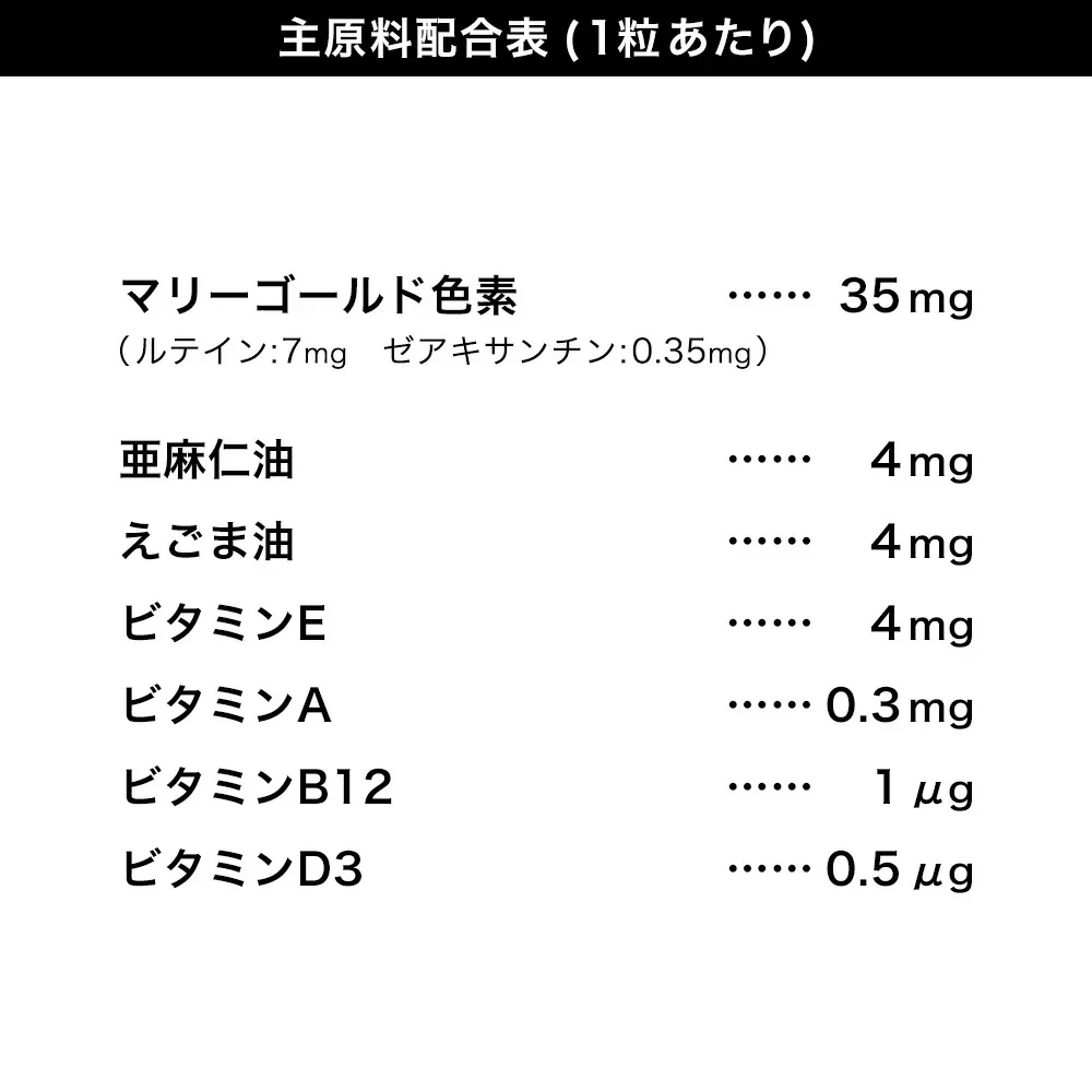こめ油(国内製造)、アマニ油、エゴマ油、ゼラチン、グリセリン、グリセリン脂肪酸エステル、ミツロウ、マリーゴールド色素(ルテイン含有)、ビタミンE、ビタミンA、ビタミンB12、ビタミンD3
