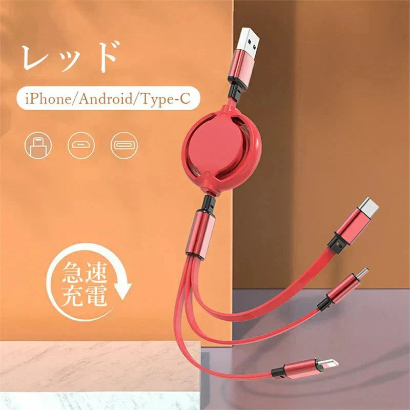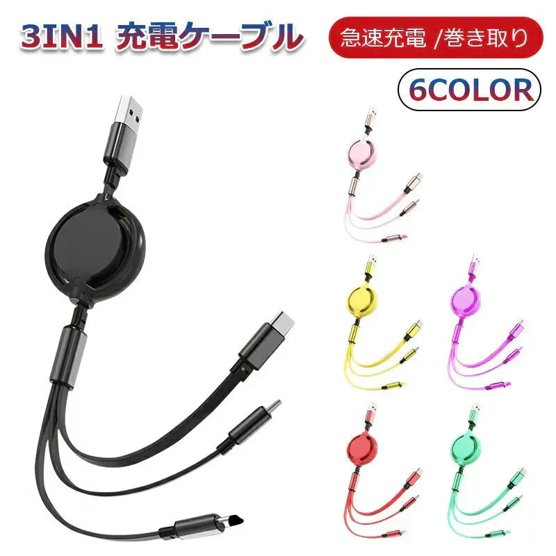 USB 3in1 充電ケーブル 3in1 巻き取り ケーブル iPhone 充電ケーブル iPhone 12 Pro Max USBケーブル 巻き取り USB Type-c 巻取り 充電 Android 一本三役 iPhone 12/12 Pro 3A 急速充電 在宅勤務 プレゼントw371(色はランダム)