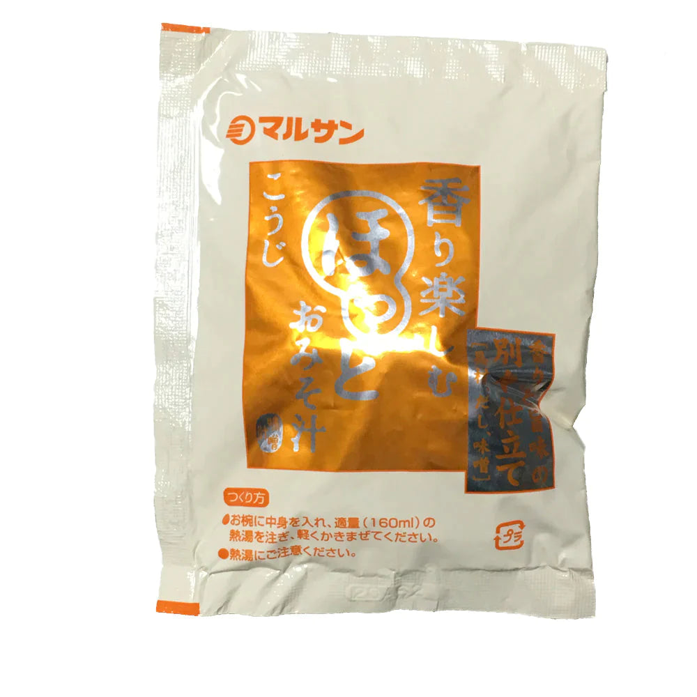 原材料 乾燥米みそ(大豆を含む)、かつお風味調味料(食塩、かつお節粉、大豆たん白加水分解物、砂糖、酵母エキスパウダー)、乾燥ねぎ、麩(小麦を含む)、わかめ/調味料(アミノ酸等)、酸化防止剤(V.E)、pH調整剤
