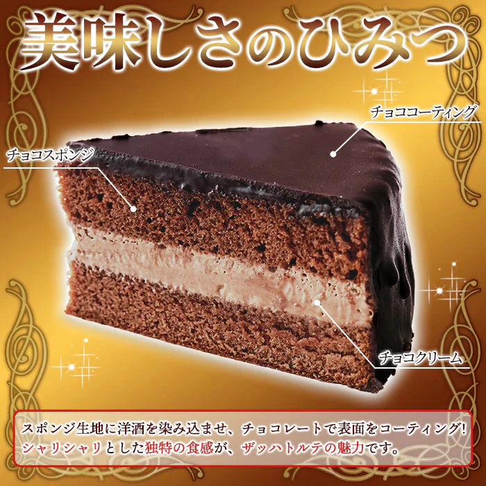 ■美味しさのひみつ チョココーティング チョコスポンジ チョコクリーム スポンジ生地に洋酒を染み込ませ、チョコレートで表面をコーティング!シャリシャリとした独特の食感が、ザッハトルテの魅力です。