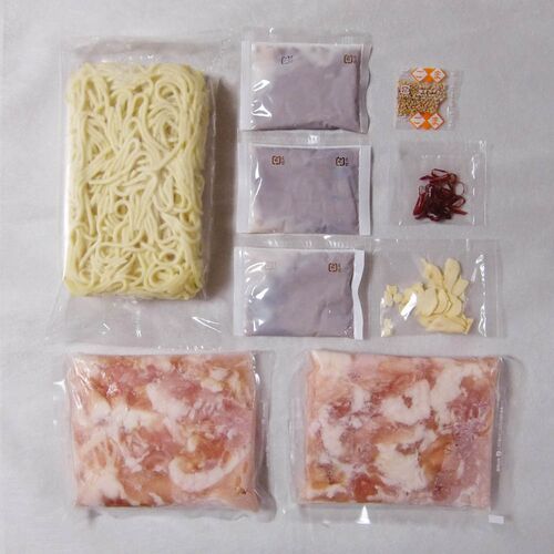 ■規格:牛もつ肉(国内産)100g×2袋、ちゃんぽん麺180g×1玉、にんにく3g×1袋、唐辛子0.5g×1袋、白ごま0.7g×1袋、もつ鍋用濃縮とんこつスープ36g×3袋