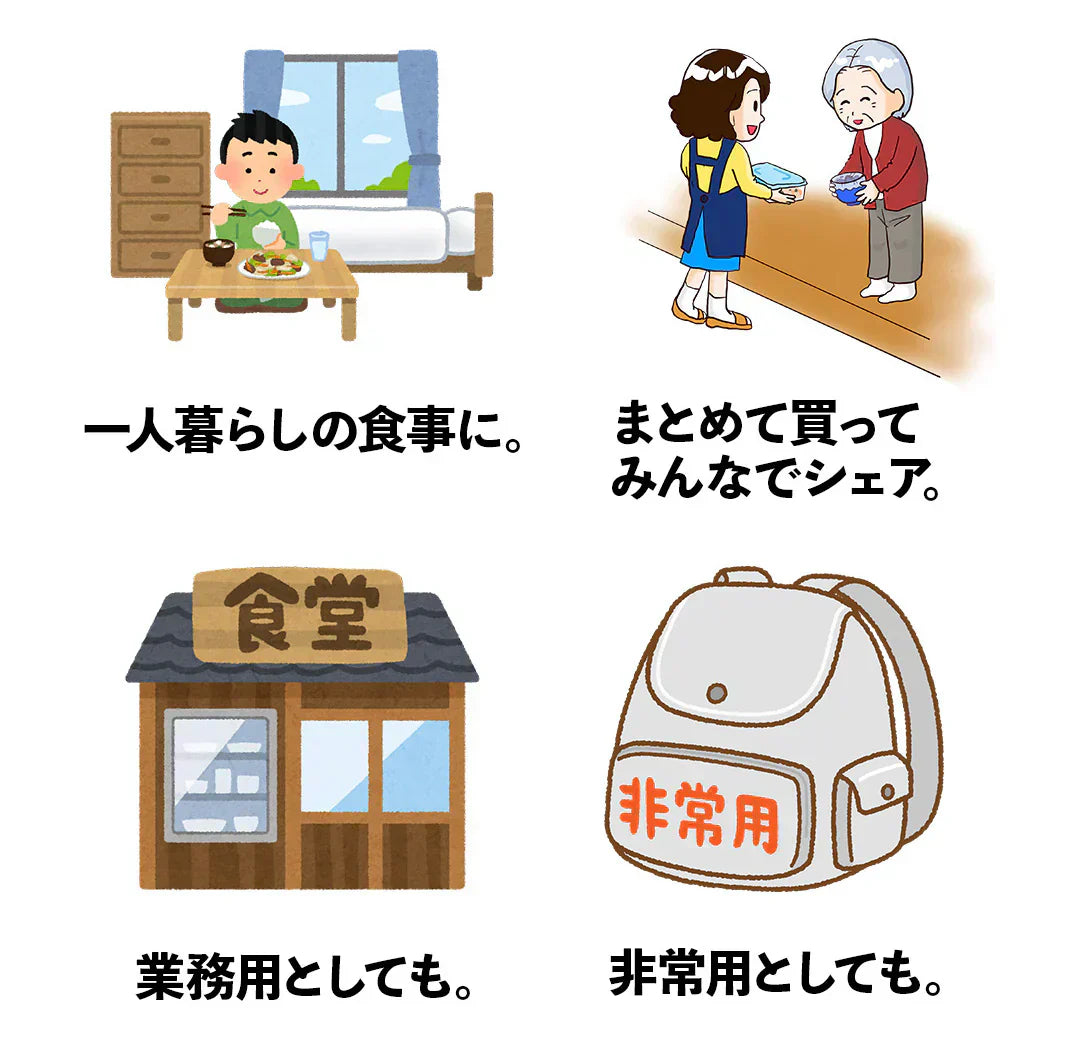 賞味期限が約1年と長く、業務用としてお使いいただいたり、災害時の非常食・保存食として備蓄しておくこともできます。