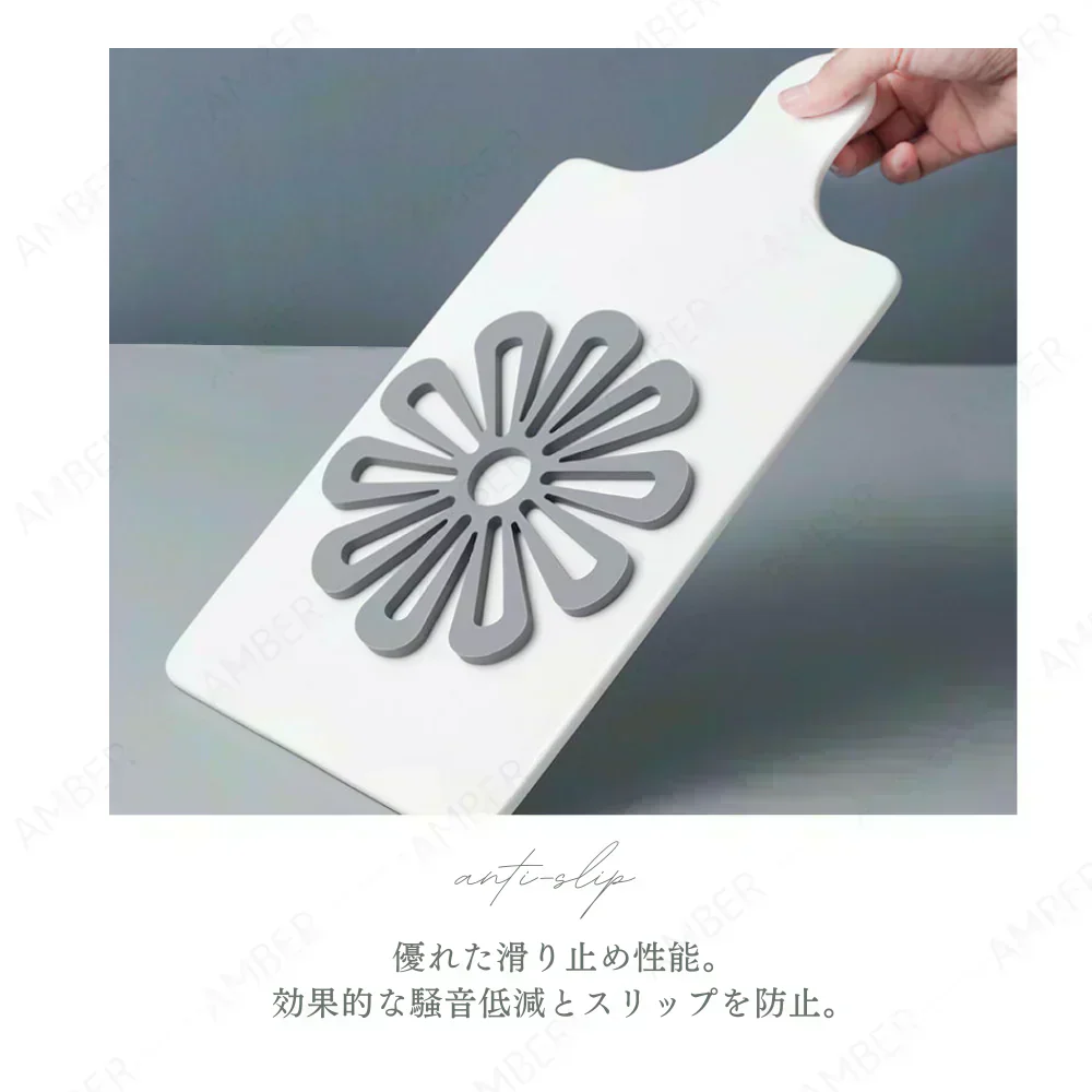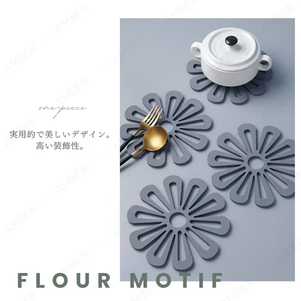 ・人気のおしゃれなキッチン雑貨、フラワーモチーフのシリコン鍋敷きになります。
