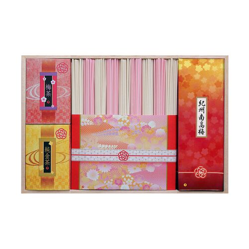 ■規格:讃岐うどん50g×5束、梅うどん50g×4束、純金茶(2g×4)×2、紀州南高梅4個 (木箱入り)