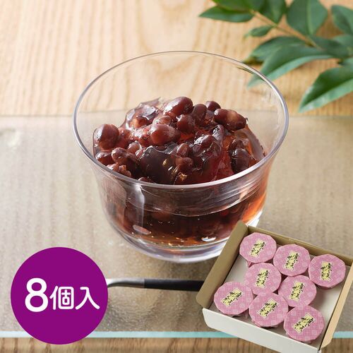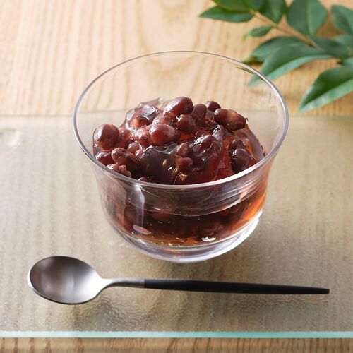原材料は、寒天とビートグラニュー糖、小豆、ほんの少しの食塩というシンプルな寒天ぜんざい。ヘルシーさが長年の人気の秘密です。シンプルなだけに素材のおいしさを最大限にお楽しみいただけます。自家製で炊き上げた小豆のひと粒ひと粒。寒天のなめらかさ。上品な甘みがのど越しを楽しませてくれます。冷たくひやして、寒天をほぐしながらお召し上がりください。