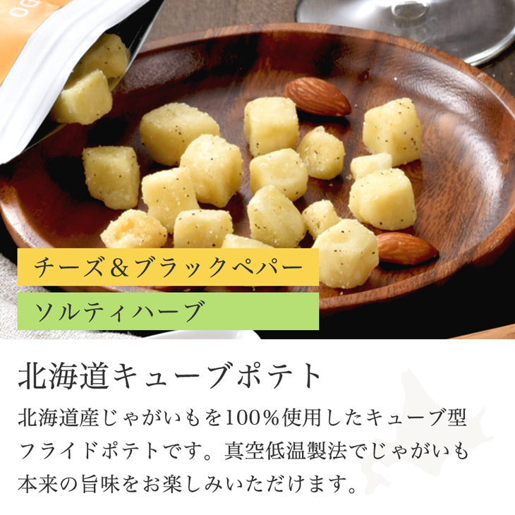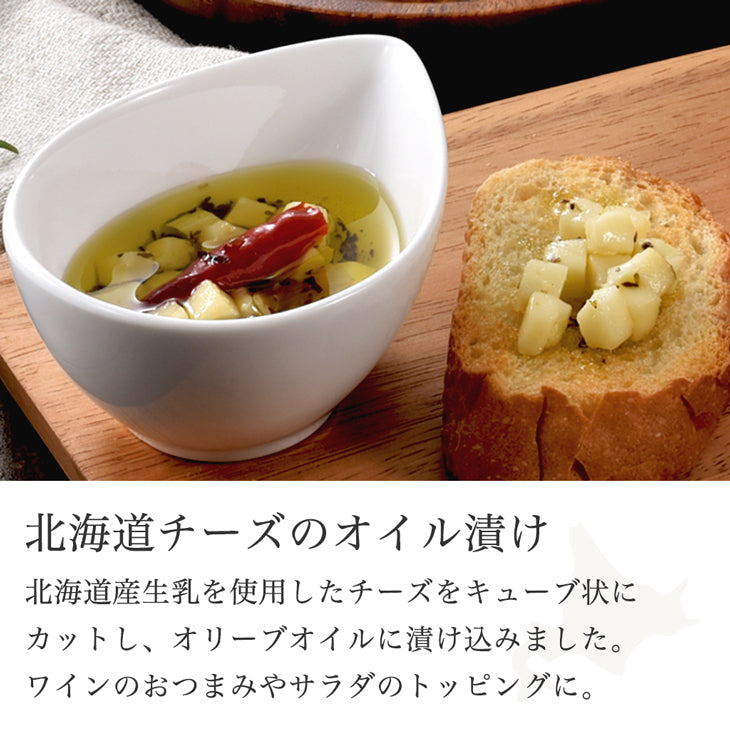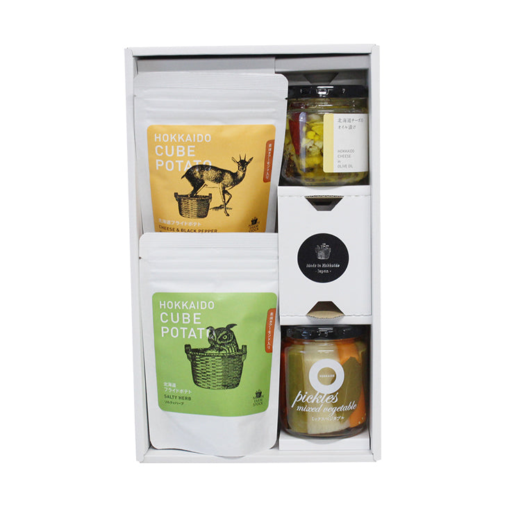 北海道産の野菜で作ったピクルスと、北海道産プロセスチーズをオリーブオイルに漬け込んだチーズのオイル漬け、真空低温製法で北海道産じゃがいも本来の旨味をお楽しみいただけるキューブポテトのセットです。道産素材本来の美味しさをお酒のおつまみとしてお楽しみください。