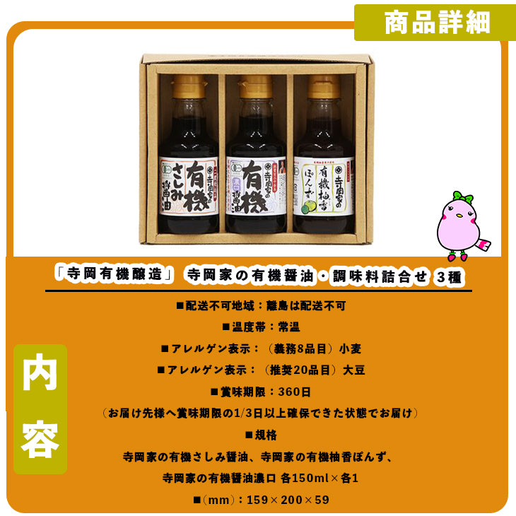 ■規格:寺岡家の有機さしみ醤油、寺岡家の有機柚香ぽんず、寺岡家の有機醤油濃口 各150ml×各1