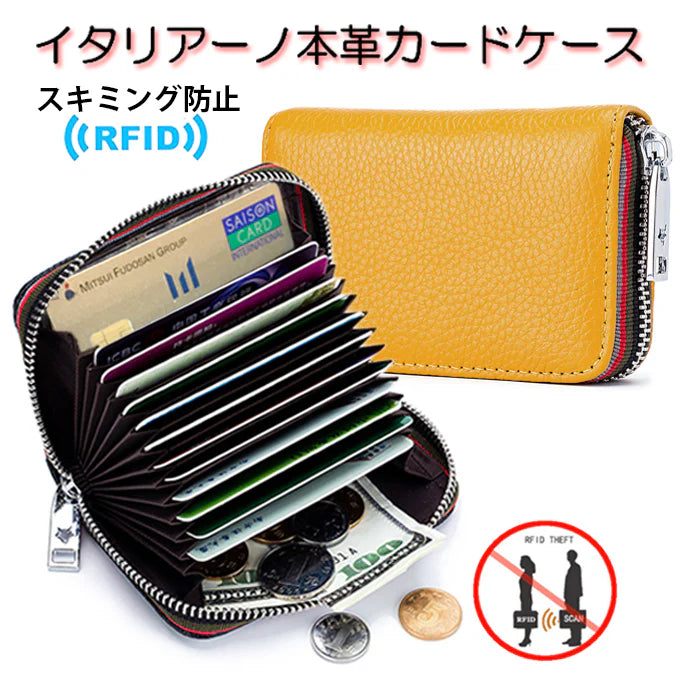 【マスタード】イタリアーノ本革カードケース|スキミング防止・14ポケット・じゃばら式・おしゃれなファスナーデザイン