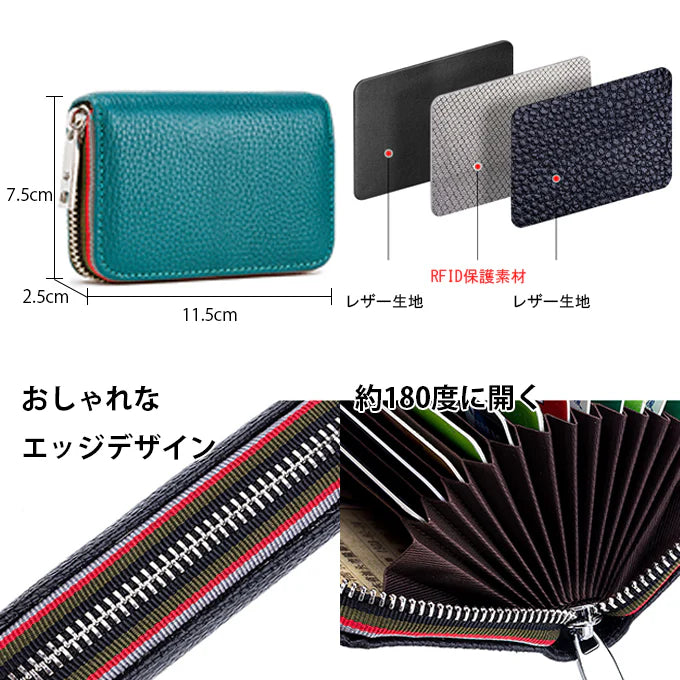 ファスナー周りのボーダーカラーがおしゃれ。カードの情報が抜き取られないスキミング防止機能付