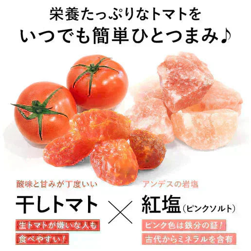 干しトマト×紅塩(ピンクソルト)の美味しいドライトマト!アクティブさんの元気チャージに、さっとひとつまみ♪手軽にサッと塩分チャージしたい!キャンプやフェスなどアウトドアのおともに!野菜不足を感じるときに!
