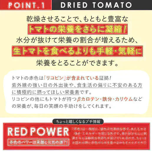 【原材料】トマト(タイ)、砂糖、岩塩/酸味料、酸化防止剤(亜硫酸塩)