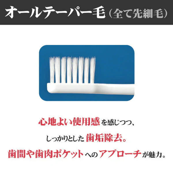 『Mふつう』の毛のかたさで『オールテーパー毛(全て先細毛)』仕様である事から、心地よい使用感を感じつつ、しっかりとした歯垢除去と歯間や歯肉ポケットへのアプローチが魅力です。