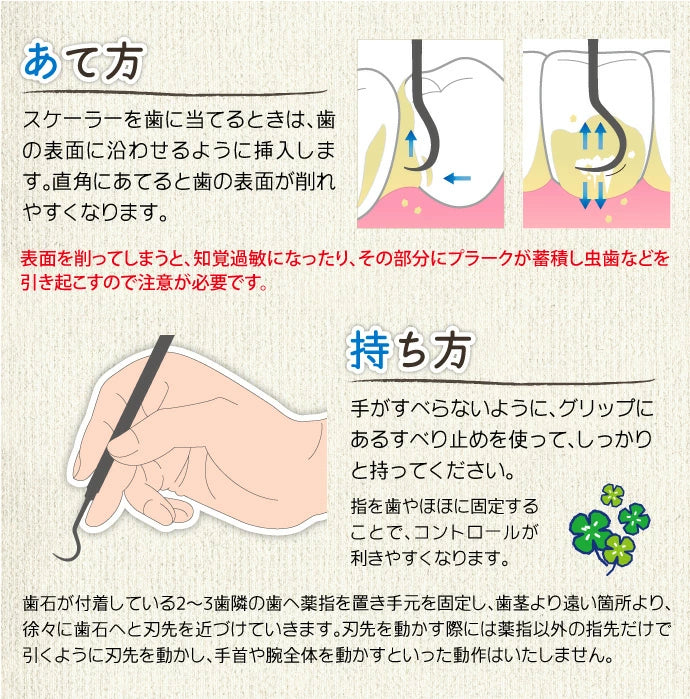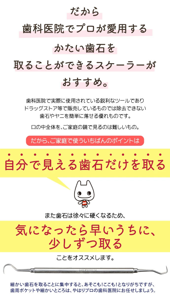 歯肉縁上の歯石・ヤニの除去にご使用頂けるステンレス製のスケーラーです。