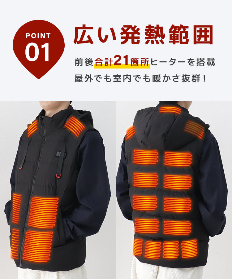 前後合計21ヶ所ヒーター搭載屋外でも室内でも暖かさ抜群