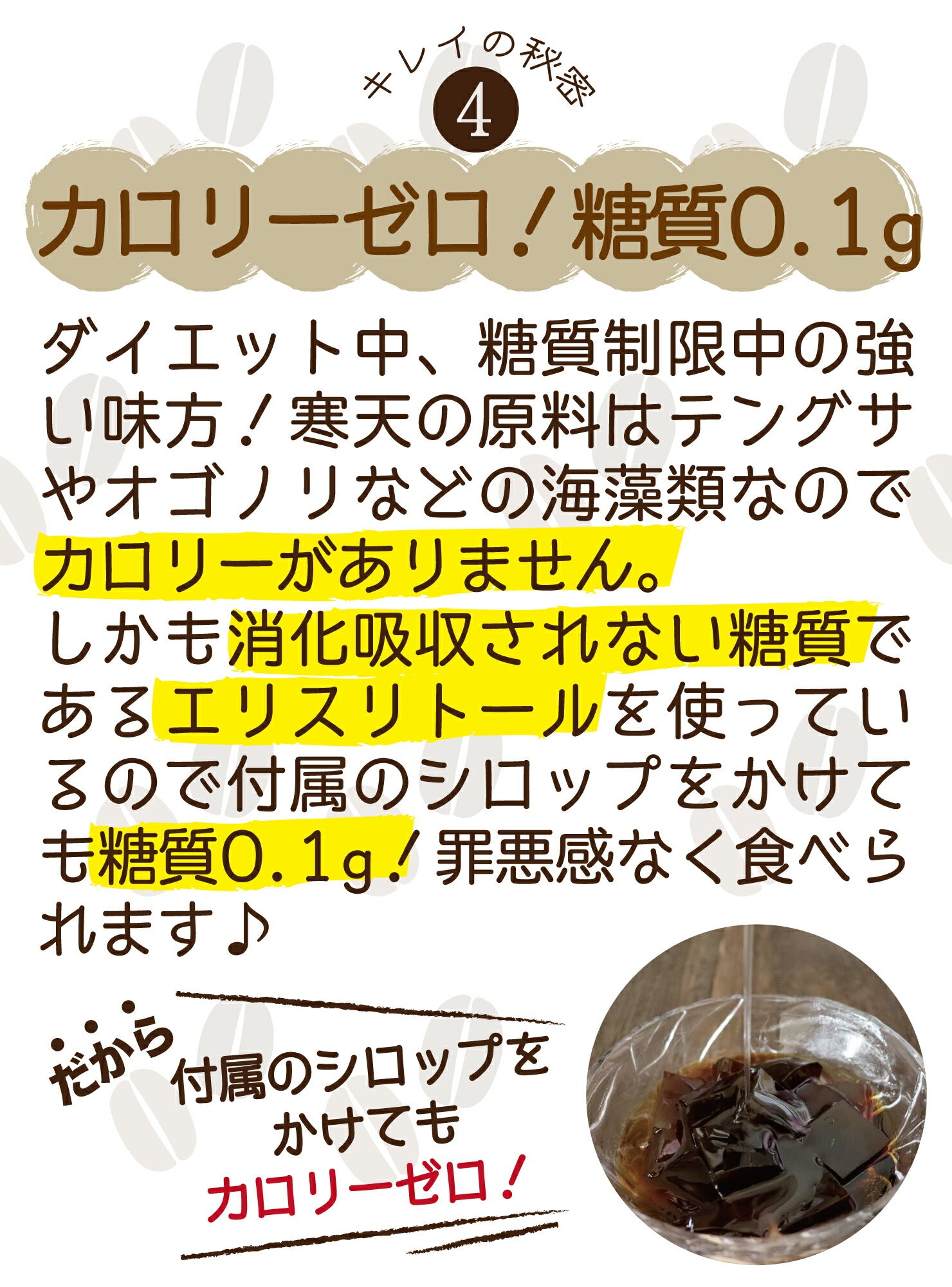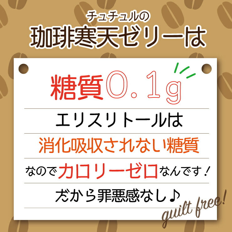 原材料名 【珈琲寒天】エリスリトール、コーヒーエキス、寒天粉末/ゲル化剤(増粘多糖類、アルギン酸ナトリウム)、香料、カラメル色素、pH調整剤