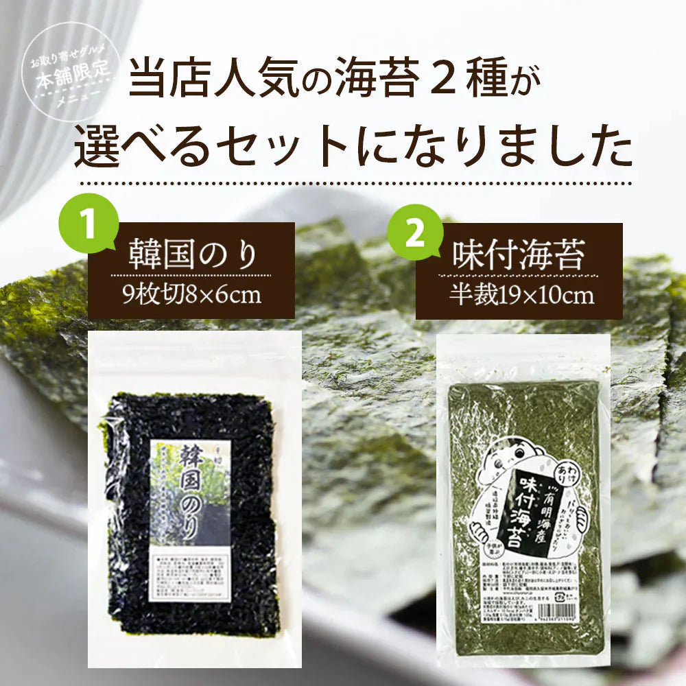 当店人気の海苔「韓国のり」セットです。いずれの海苔も便利なチャック付き袋に入っていますので、いつでも美味しくお召し上がりいただけます。
