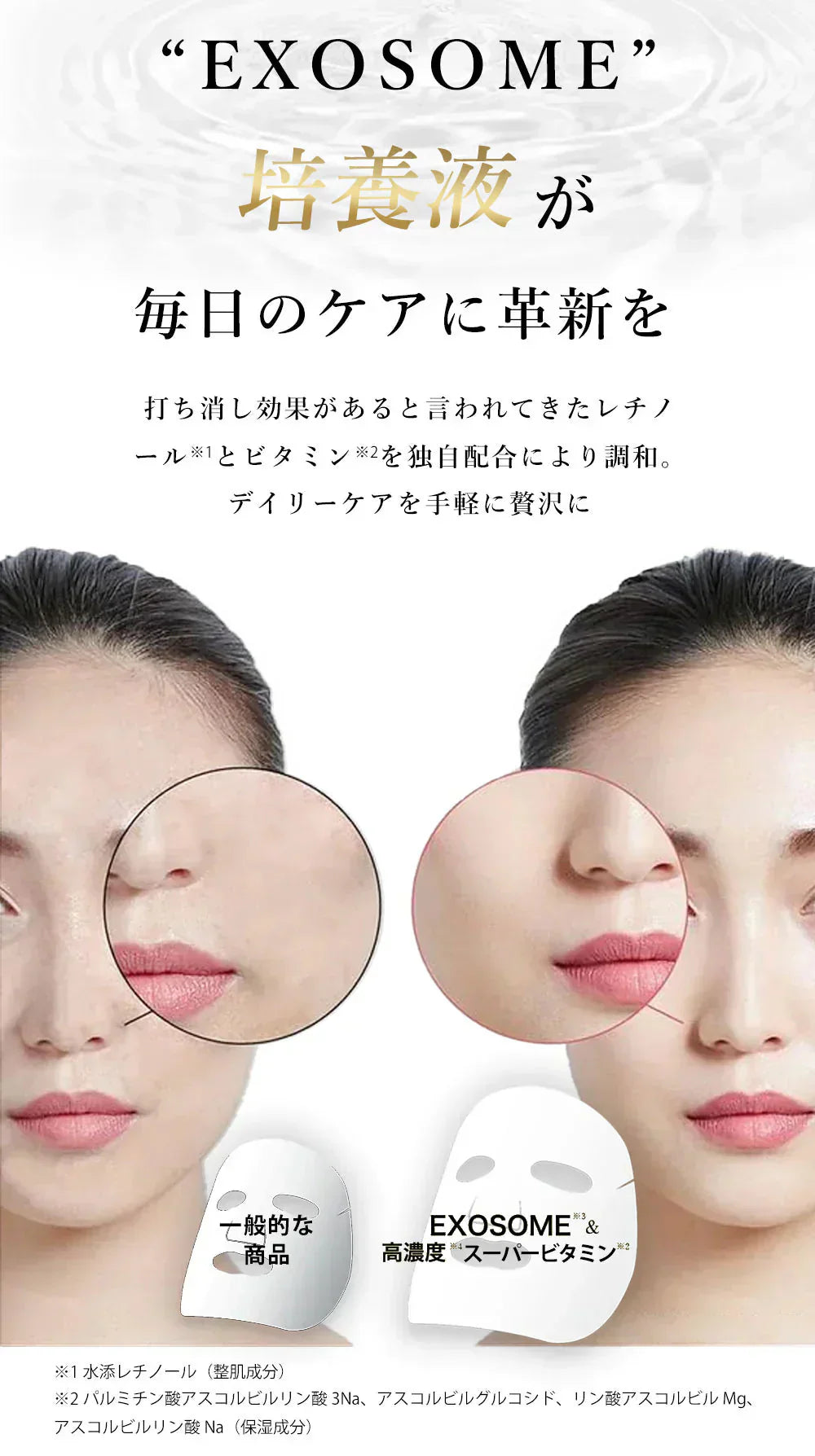 【成 分】水、グリセリン、DPG、BG、ヒト脂肪由来間葉系細胞エクソソーム、ヒト幹細胞順化培養液、パンテノール、パルミチン酸アスコルビルリン酸3Na、アスコルビルグルコシド、リン酸アスコルビルMg、アスコルビルリン酸Na、水添レチノール、トコフェロール、ナイアシンアミド、ヒアルロン酸Na、ニンニク根エキス、ローマカミツレ花エキス、ゴボウ根エキス、アルニカ花エキス、セイヨウキズタ葉/茎エキス、オドリコソウ花/葉/茎エキス、オランダガラシ葉/茎エキス、セイヨウアカマツ球果エキス、ローズマリー葉エキス、トレハロース、エチドロン酸4Na、キサンタンガム、ラベンダー油、レモン果皮油、ライム油、レモングラス油、エンピツビャクシン油、ローズマリー葉油、クエン酸、クエン酸Na、PEG-60水添ヒマシ油、メチルパラベン、フェノキシエタノール、水添レシチン、1,2-ヘキサンジオール、ポリソルベート80、カプリリルグリコール、酢酸トコフェロール、アスコルビルメチルカルボニルペンタペプチド-72-トリ-t-ブチルトリプトファナミド、トリ(カプリル酸/カプリン酸)グリセリル