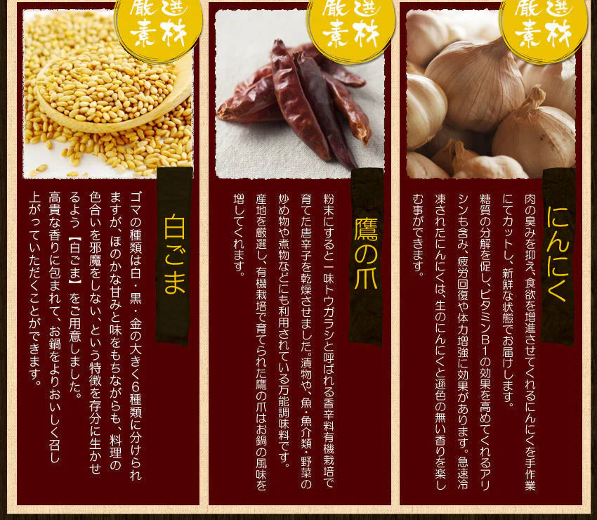・内容量:ホルモン約1200g(200g×6袋)・ラーメン3玉・もつ鍋スープ小3袋・薬味(にんにくスライス・輪切り唐辛子×2もしくは白ごま×3)
