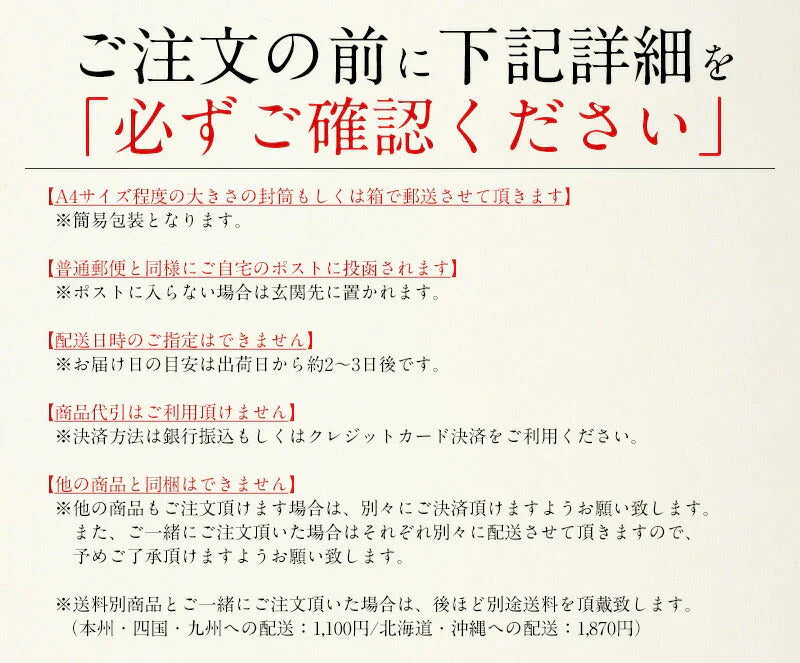 ・商品代引はご利用頂けません。(銀行振込、クレジットカード決済をご利用ください)