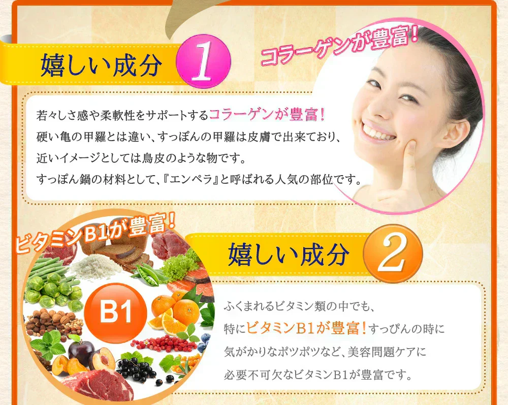 サフラワー油(国内製造)、大豆ペプチド、もろみ酢粉末、スッポン粉末/ゼラチン、グリセリン、ミツロウ、グリセリン脂肪酸エステル、果実色素、植物レシチン(大豆由来)