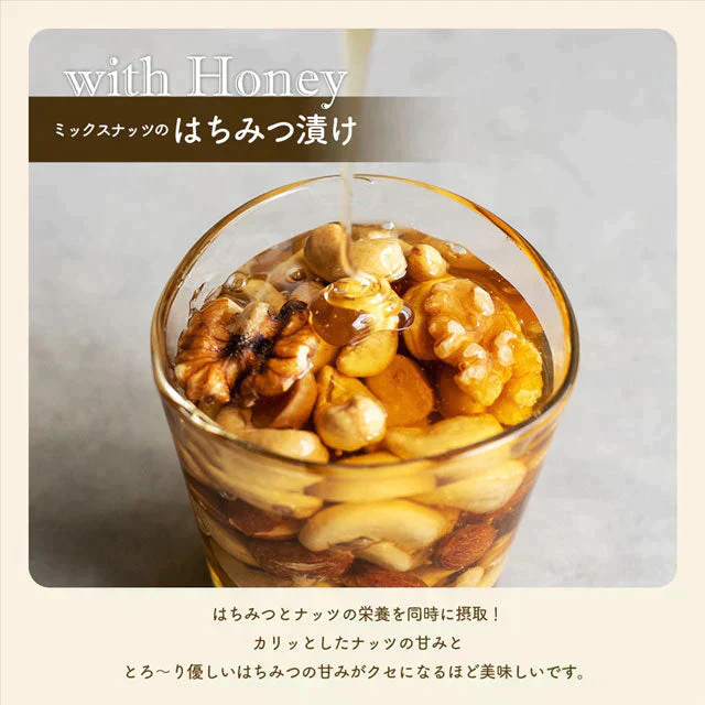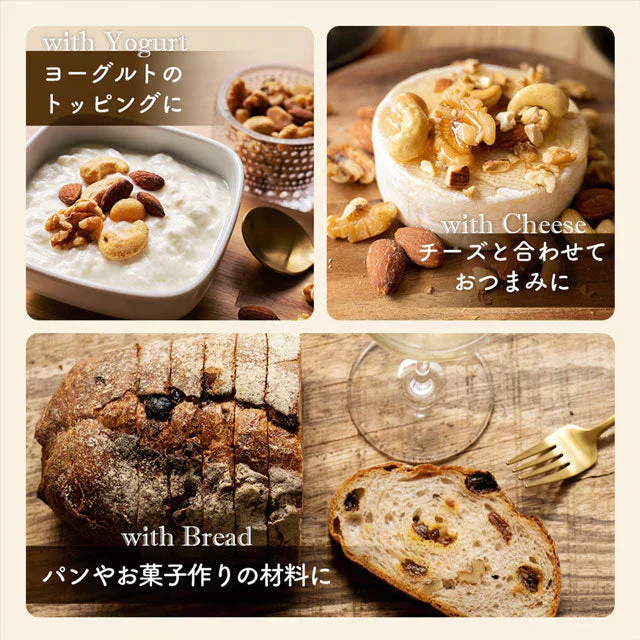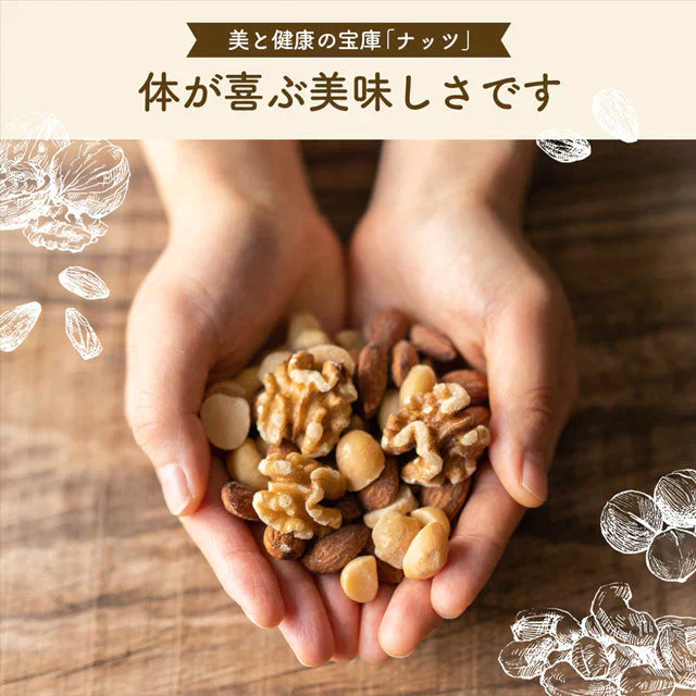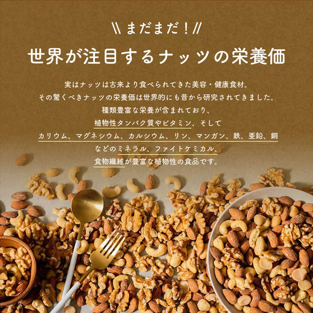 高級ナッツである、素煎りアーモンドとクルミ、マカダミアナッツ、カシューナッツを贅沢に絶妙なバランスで仕上げたミックスナッツです。この道のプロが「飽き」がこない絶妙なバランス配合を考えた逸品です。