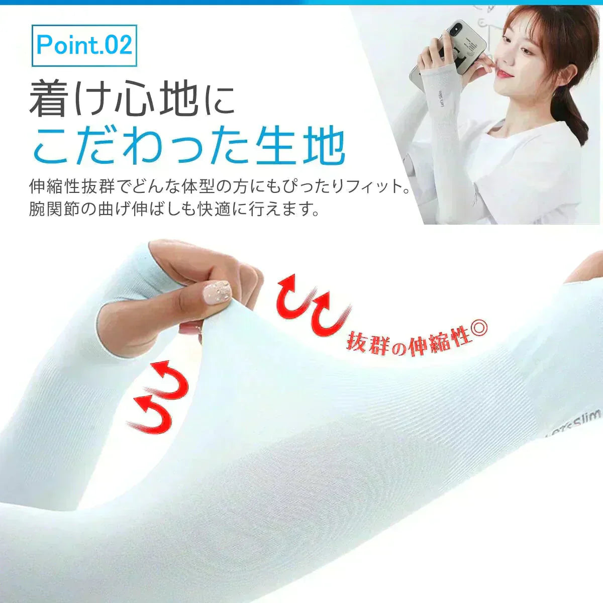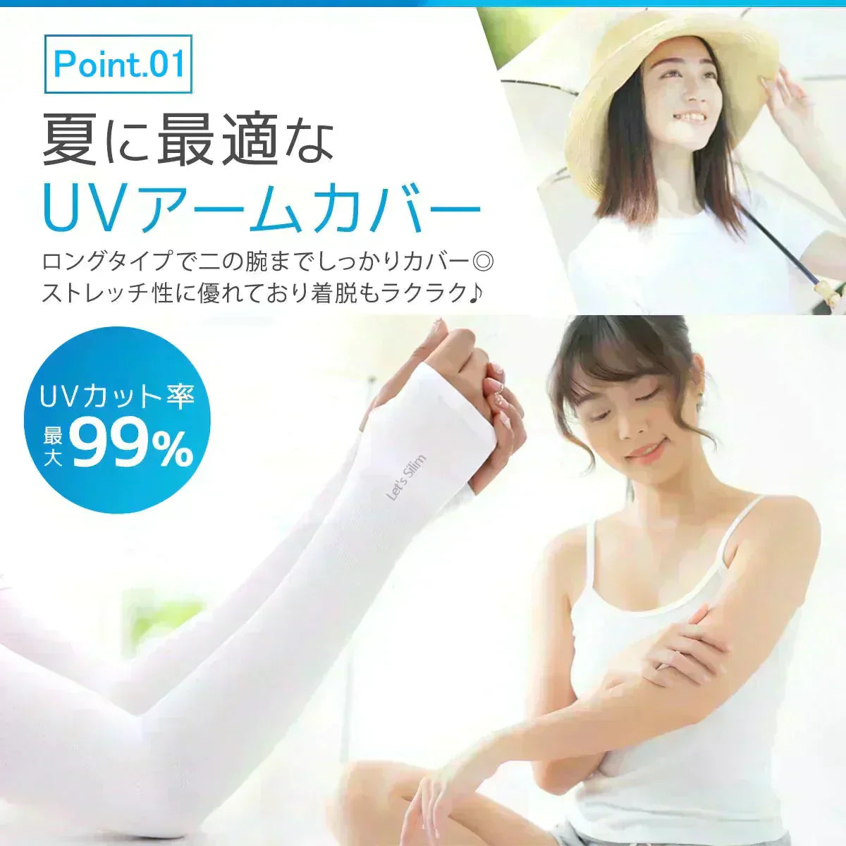 【Point.1 夏に最適なUVアームカバー】ロングタイプで二の腕までしっかりカバーストレッチ性に優れており着脱もラクラク♪最大UVカット率99%で強い日差しからお肌をしっかりと守ります