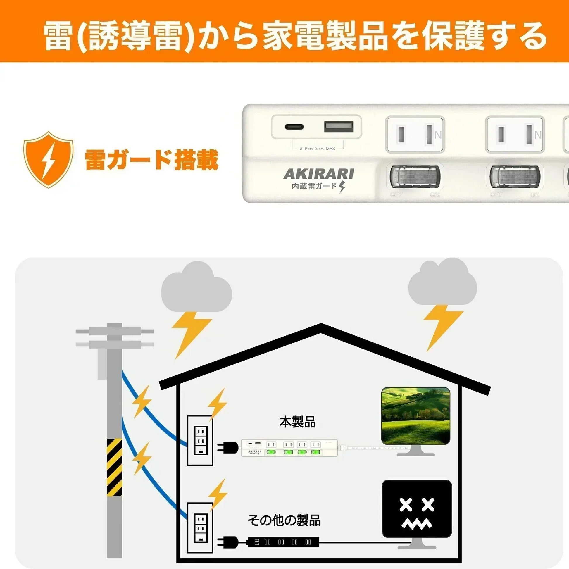 内蔵されたサージ吸収素子(バリスタ)が雷サージを吸収し、接続機器を守ります。雷ガード搭載の電源タップは、家庭やオフィスの電気設備の安全性を向上させます。雷ガード機能により、電気系統への異常な電圧や電流の侵入を防ぐことで、火災や感電のリスクを低減します。パソコンやテレビなどの精密機器を雷から守る。高性能雷サージ吸収素子内蔵、安全性と使い勝手に配慮した雷ガードタップ。