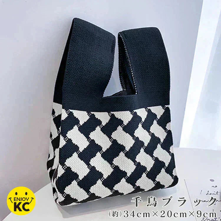 【千鳥ブラック】SNS大人気 ニットマルシェバッグ レディース 小さめ ニットバッグ 韓国 ミニバッグ ハンドバッグ トートバッグ おしゃれ