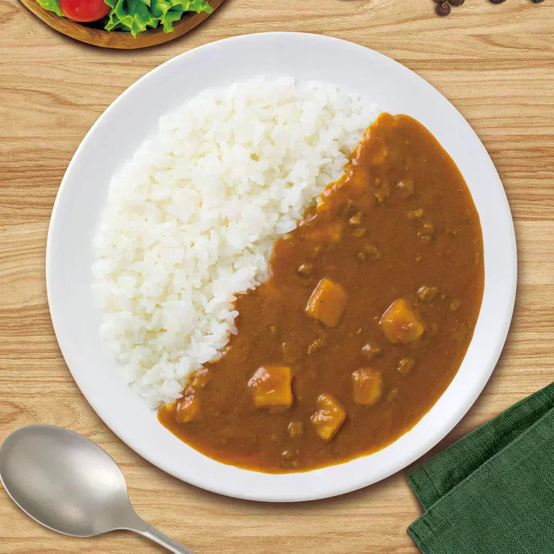 原材料 野菜(玉ねぎ(中国又は国産)、じゃがいも)、豚脂、小麦粉、砂糖、りんごペースト、トマトペースト、カレー粉、食塩、粒状大豆たん白、ビーフエキス、ウスターソース、チャツネ、にんにくペースト、クリーム加工品、唐辛子/増粘剤(加工でん粉)、調味料(アミノ酸等)、着色料(カラメル、ココア)、香料、酸味料、(一部に小麦・乳成分・牛肉・大豆・りんごを含む)
