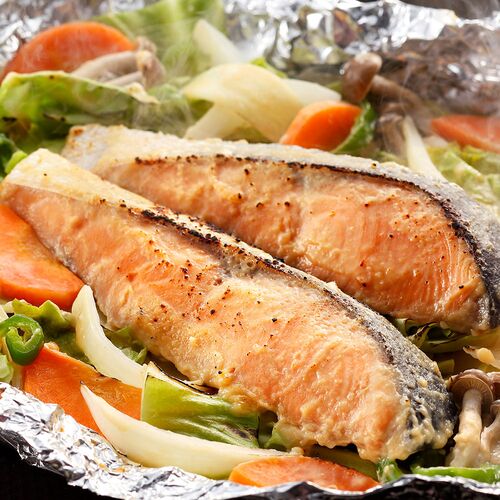 ●鮭のちゃんちゃん焼き:白鮭(知床羅臼産)、味噌、砂糖、還元水飴、清酒、みりん、玉ねぎ、(一部にさけ・大豆を含む)