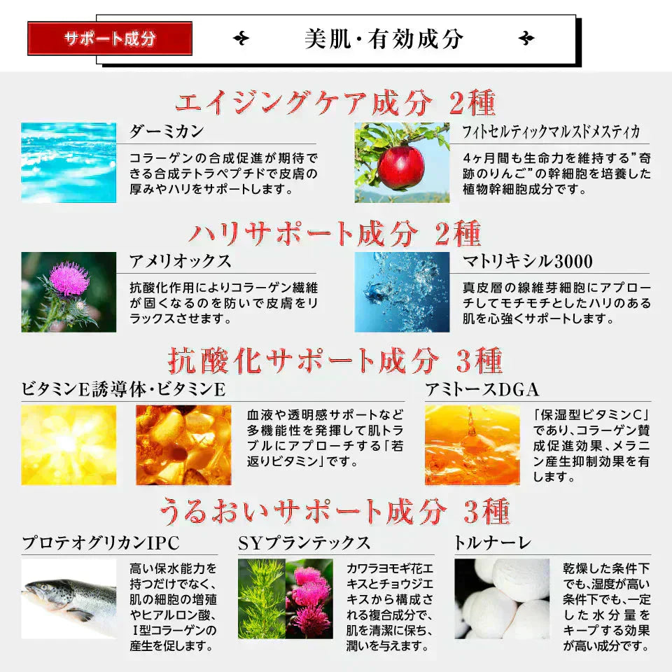 エイジレス成分のテロセンスや2種のヒト幹細胞培養液などのエイジングケア成分が、老化のカギを握るテロメアをサポートして、シミやシワ、たるみ速攻に速攻アプローチ。肌悩みの解消された不老の美肌を目指します。