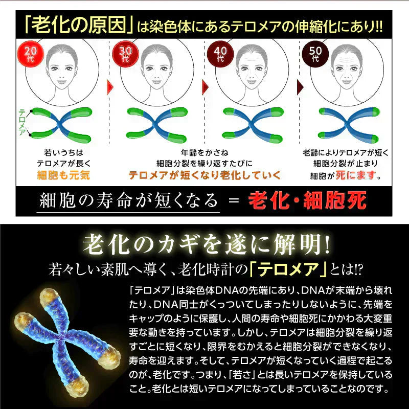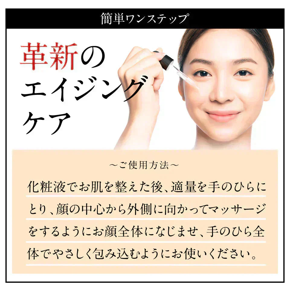 本商品は、ノーベル生理学医学賞を受賞して世界が注目する“老化時計”のテロメア研究と、幹細胞サイエンスを融合した先端のプレミアム美容液です。