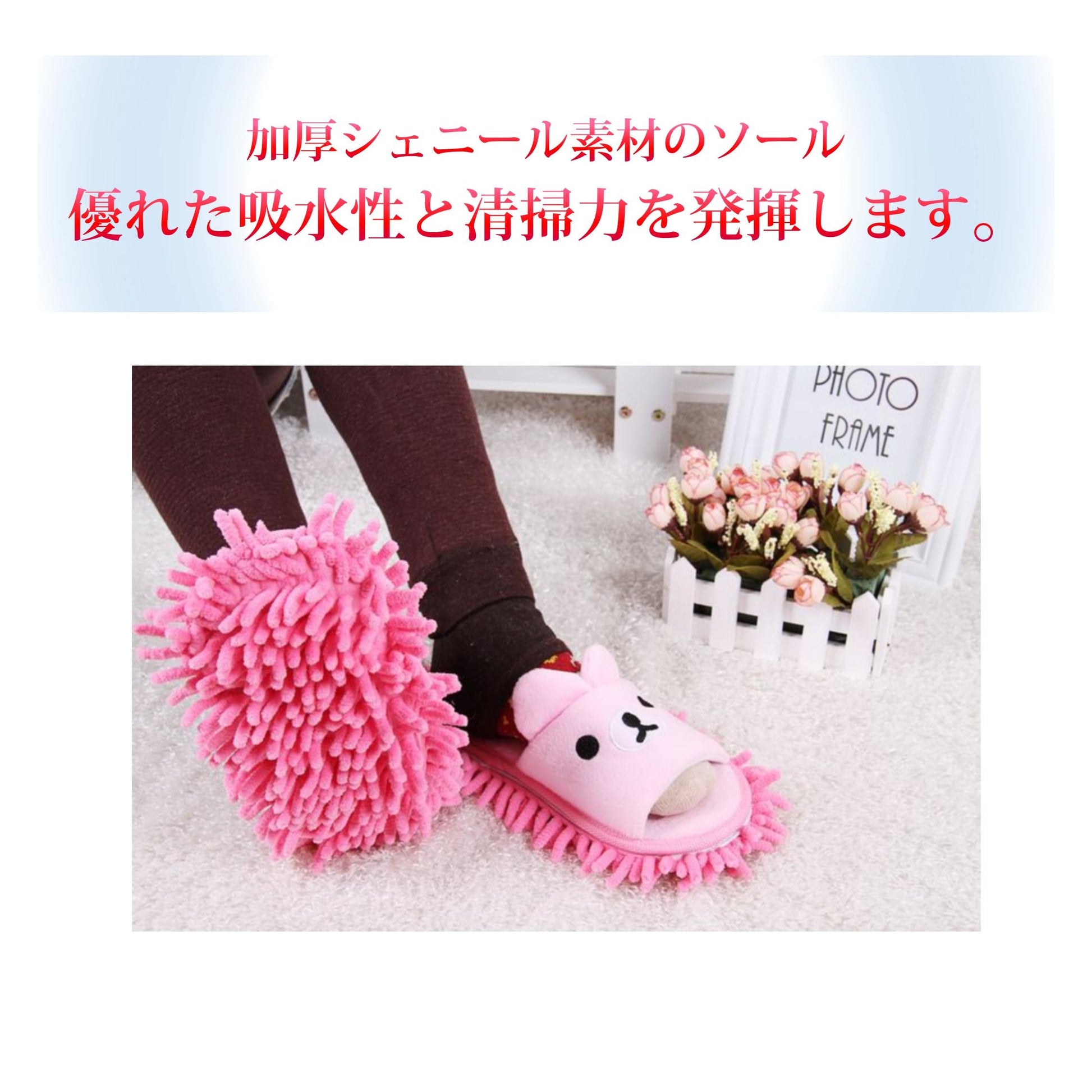加厚シェニール素材のモップ付きソール:モップ部分は取り外し可能で、水洗いも簡単。優れた吸水性と清掃力を発揮します。